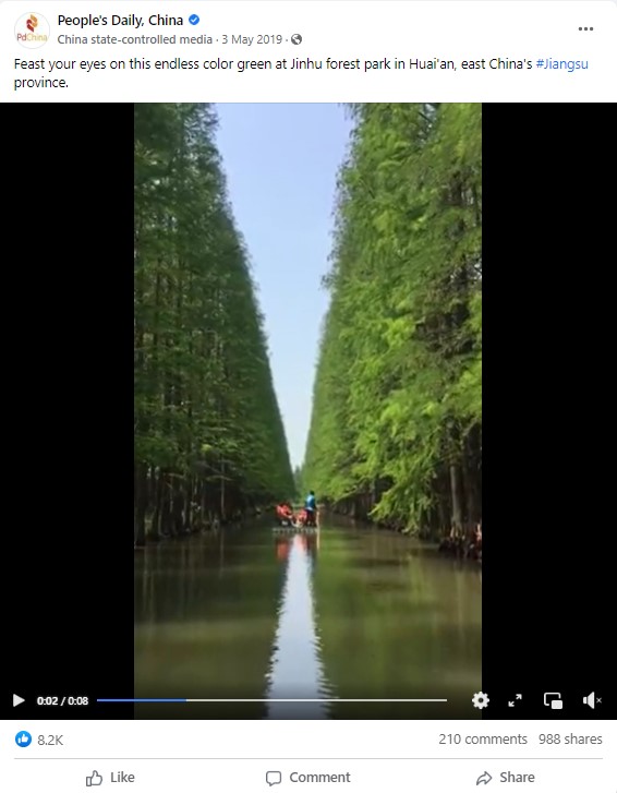 வைரல் வீடியோவின் 8வது ப்ரேமை Yandex ரிவர்ஸ் சர்ச் முறைக்கு உள்ளாக்கியபோது அது People’s Daily China வெளியிட்டிருந்த பேஸ்புக் பதிவிற்கு இட்டுச் சென்றது. அதில், வைரல் கீ-ப்ரேமில் உள்ள அதே புகைப்படம் “Feast your eyes on this endless colour green at Jinhu forest park in Huai’an, east China’s #Jiangsu province.” என்கிற தலைப்புடன் இடம் பெற்றிருந்தது.