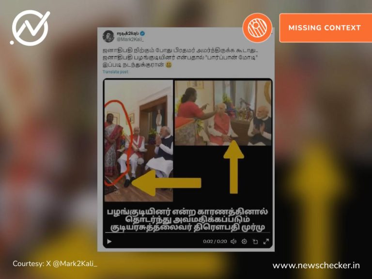 பாஜக மூத்த தலைவர் அத்வானிக்கு அவரது வீட்டிற்கு சென்று நேரில் பாரத் ரத்னா விருதினை வழங்கிய குடியரசுத்தலைவர் திரெளபதி முர்மு ஆசனம் அளிக்கப்படாமல் நிற்க வைக்கப்பட்டதாகப் பரவும் புகைப்படத்தகவல் தவறானதாகும்.