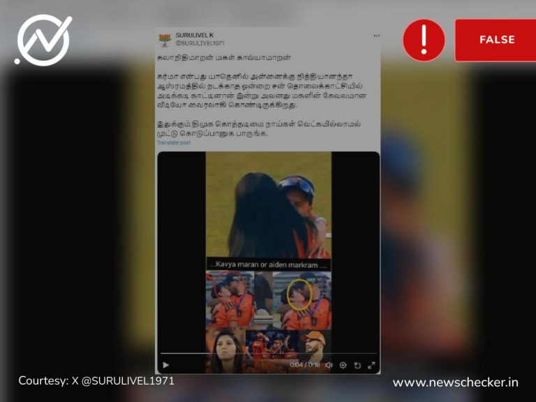 கலாநிதி மாறன் மகளும், சன் ரைசர்ஸ் ஹைதராபாத் அணி உரிமையாளருமான காவ்யா மாறன், தென்னாப்பிரிக்க வீரர் ஐடன் மார்க்ரமிற்கு முத்தம் கொடுத்ததாகப் பரவும் வீடியோ போலியானதாகும்.