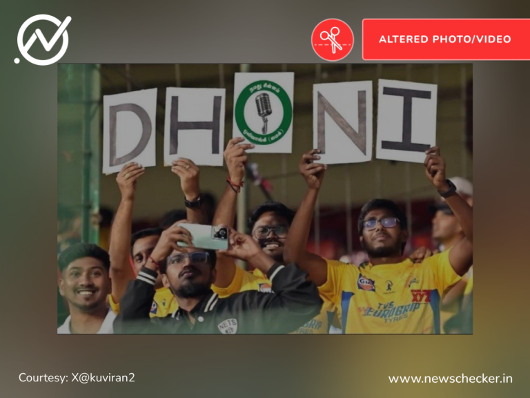 ஐபிஎல் மைதானத்தில் ரசிகர் ஒருவர் ஏந்திய பலகையில் தோனி பெயருக்குள் மைக் சின்னம் இருந்ததாக வைரலாகும் படம் எடிட் செய்து மாற்றப்பட்டதாகும்.
