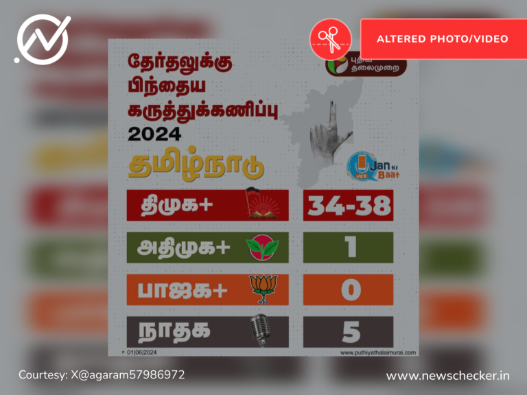 “நாதக 5 இடங்களில் வெற்றி பெறும்; பாஜக கூட்டணி பூஜ்ஜிய இடங்களையே பெறும்” என்று புதிய தலைமுறை கருத்துக்கணிப்பு வெளியிட்டதாக வைரலாகும் படம் எடிட் செய்யப்பட்டு மாற்றப்பட்ட போலி புகைப்படமாகும்.
