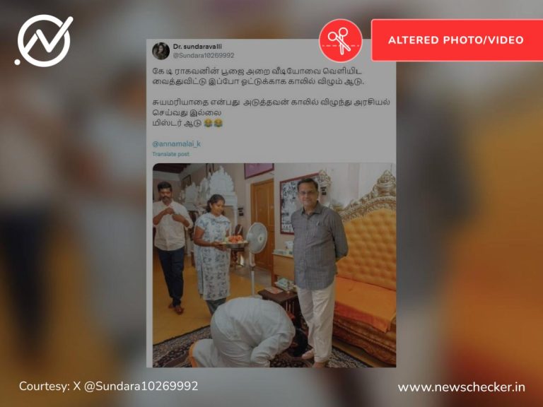 KT ராகவன் காலில் விழுந்த அண்ணாமலை என்று பரவும் புகைப்படம் எடிட் செய்யப்பட்டதாகும்.