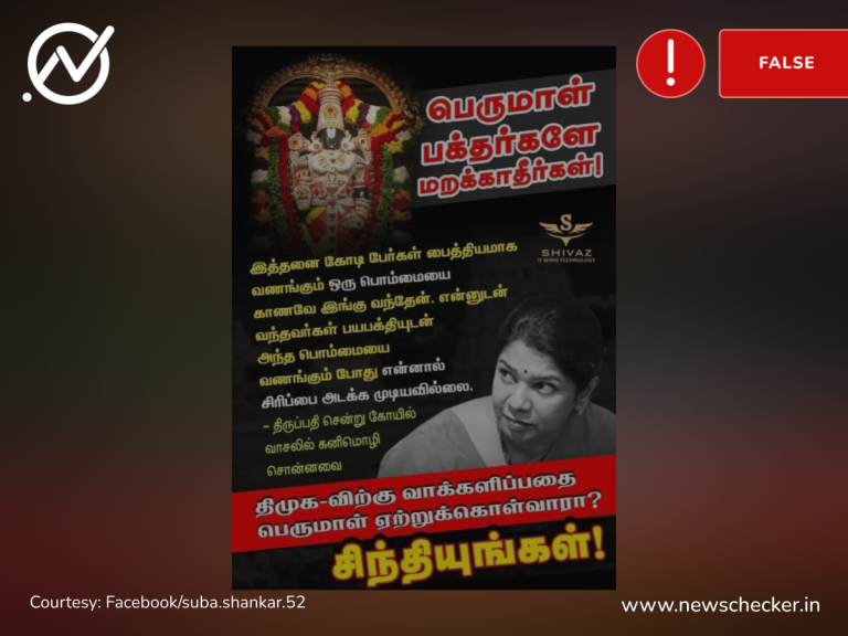 திருப்பதி வெங்கடாசலபதி சிலையை பொம்மை என்று கனிமொழி கூறியதாக பரவும் தகவல் முற்றிலும் தவறானதாகும்.