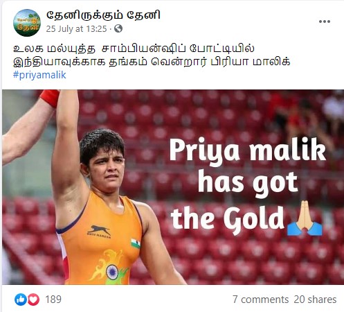 உலக கேடட் மல்யுத்த சாம்பியன்ஷிப் போட்டியில் தங்கம் வென்ற பிரியா மாலிக் அவர்களின் புகைப்படம் என்று புகைப்படங்கள் சில சமூக வலைத்தளங்களில் பரவி வருகின்றது.