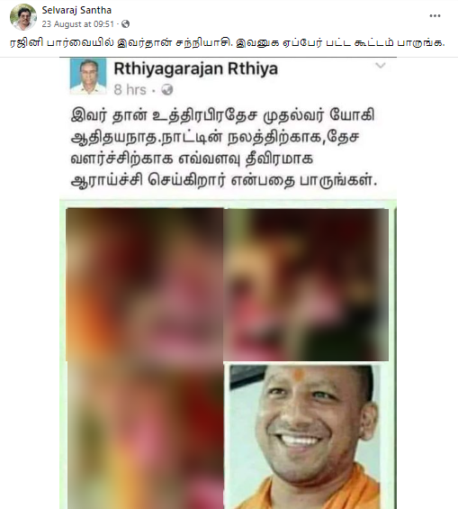 நடிகர் ரஜினிகாந்த் உத்திரப்பிரதேச முதலமைச்சர் யோகி ஆதித்யநாத்தின் காலில் விழுந்த சம்பவம் சர்ச்சையை ஏற்படுத்திய நிலையில், “சந்நியாசிகள் வயதில் சிறியவராக இருந்தாலும் அவர்களது காலில் விழுவது என் பழக்கம்” என்று சம்பவம் குறித்து விளக்கமளித்திருந்தார் ரஜினிகாந்த்.