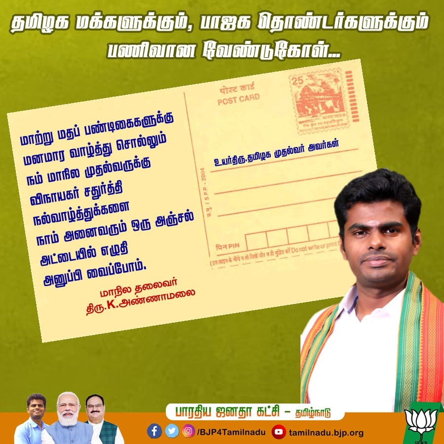 தமிழ்நாடு பாஜகவின் அதிகாரப்பூர்வ சமூக வலைத்தளப் பக்கத்தில் இதுபோன்ற புகைப்பட அறிவிப்பு எதுவும் வெளியாகியிருக்கிறதா என்று தேடியபோது, “மாற்று மதப் பண்டிகைகளுக்கு மனமார வாழ்த்து சொல்லும் நம் மாநில முதல்வருக்கு விநாயகர் சதுர்த்தி நல்வாழ்த்துக்களை நாம் அனைவரும் ஒரு அஞ்சல் அட்டையில் எழுதி அனுப்பி வைப்போம்” என்கிற அறிவிப்பு மாநிலத் தலைவர் கே.அண்ணாமலை சார்பில் வெளியாகியிருந்தது.