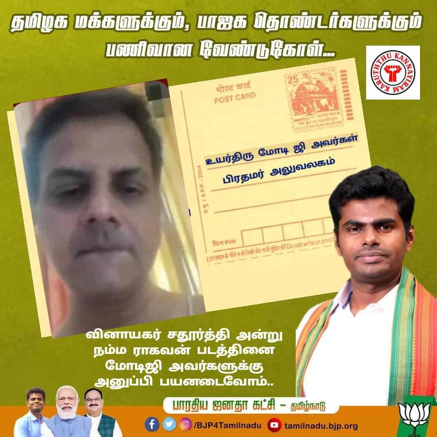 இந்நிலையில், “தமிழக மக்களுக்கும், பாஜக தொண்டர்களுக்கும் பணிவான வேண்டுகோள் வினாயகர் சதுர்த்தி அன்று நம்ம ராகவன் படத்தினை மோடிஜி அவர்களுக்கு அனுப்பி பயனடைவோம்” என்று பாஜக தமிழ்நாடு தலைவர் அண்ணாமலை சார்பில் தமிழக பாஜகவின் அதிகாரப்பூர்வ சமூக வலைத்தளப்பக்கம் அறிவிப்பு வெளியிட்டுள்ளதாகப் புகைப்படம் ஒன்று சமூக வலைத்தளங்களில் வைரலாகிறது.