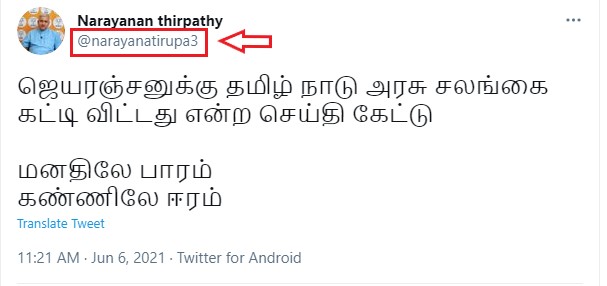 நாரயணன் திருப்பதி அவர்களின் அதிகாரப்பூர்வ டிவிட்டர் கணக்கின் ஐடி @Narayanan3 என்பதாகும். ஆனால் வைரலாகும் டிவீட் @narayanatirupa3 என்கிற ஐடியிலிருந்து பதிவிடப்பட்டுள்ளது. மேலும் அந்த ஐடியிலேயே அது Parody(போலி)கணக்கு என்று குறிப்பிடப்பட்டுள்ளது.