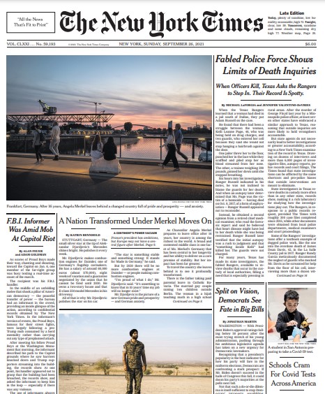 ஆகவே வைரலாகும் புகைப்படத்தில் குறிப்பிட்டுள்ள செப்டம்பர் 26 ஆம் தேதியின் நியூயார்க் டைம்ஸ் பத்திரிக்கையின் முகப்பு பக்கததை அதன் அதிகாரப் பூர்வ இணையத்தளத்தில் தேடினோம்.