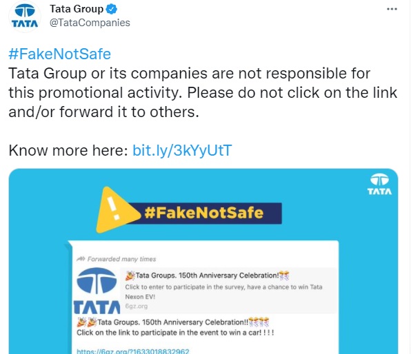 Tata Group or its companies are not responsible for this promotional activity. Please do not click on the link and/or forward it to others.” என்று குறிப்பிட்ட போலிச்செய்தியை நம்பவேண்டாம் என தெரிவித்துள்ளது.