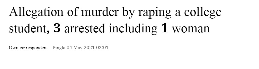அதில், மேற்கு வங்கத்தில் மேற்கு மிட்னாப்பூர் மாவட்டத்தின் பிங்கலா காவல் நிலையத்தின் கீழ் வருகின்ற ஜம்னா என்னும் கிராமத்தில் இரண்டாம் ஆண்டு கல்லூரி மாணவியான சினேகா (பெயர் மாற்றப்பட்டுள்ளது) பாலியல் வன்கொடுமைக்கு உள்ளாக்கப்பட்டு கொலை செய்யப்பட்டுள்ளார். மே 3 ஆம் தேதியன்று காணமல் போன அவர், சடலமாக மீட்கப்பட்டுள்ளார். என்று குறிப்பிடப்பட்டுள்ளது. மேற்கு வங்க ஊடகங்கள் சிலவும் இதனைப் பகிர்ந்துள்ளன.