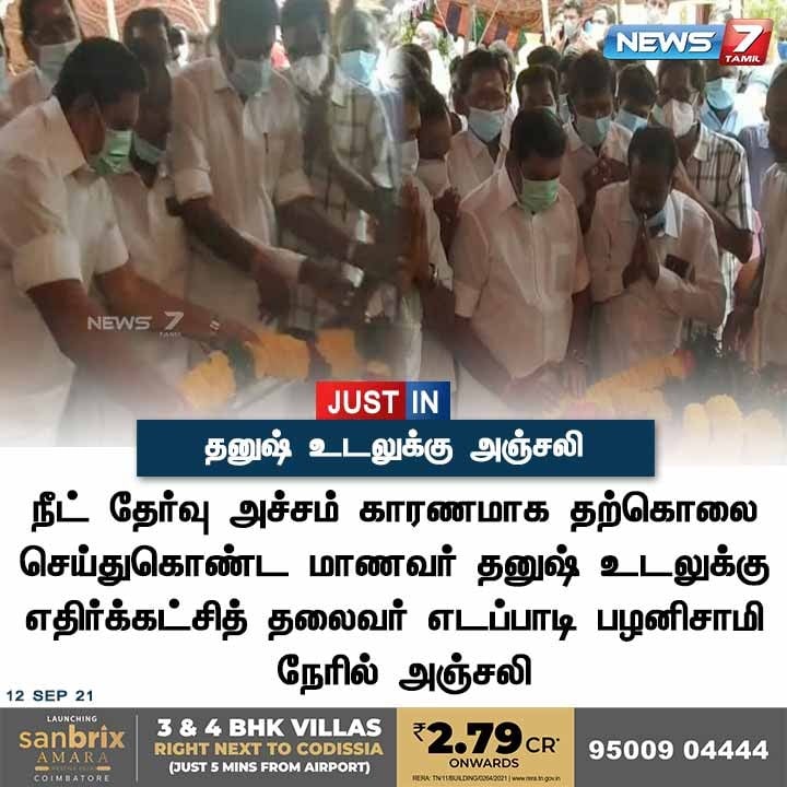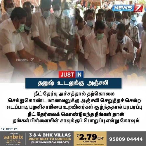 இந்நிலையில் தமிழக முன்னாள் முதல்வர் எடப்பாடி பழனிசாமி அவர்கள் தனுஷின் உடலுக்கு அஞ்சலி செலுத்த சென்றபோது, “நீட் தேர்வைக் கொண்டு வந்த நீங்கள்தான் என் பிள்ளையின் சாவுக்கு பொறுப்பு” என்று கூறி தனுஷின் உறவினர்கள் அவருக்கு எதிராக கோஷமிட்டதாக நியூஸ் 7 தமிழின் நியூஸ்கார்ட் ஒன்று சமூக வலைத்தளங்களில் வைரலாகி வருகின்றது.