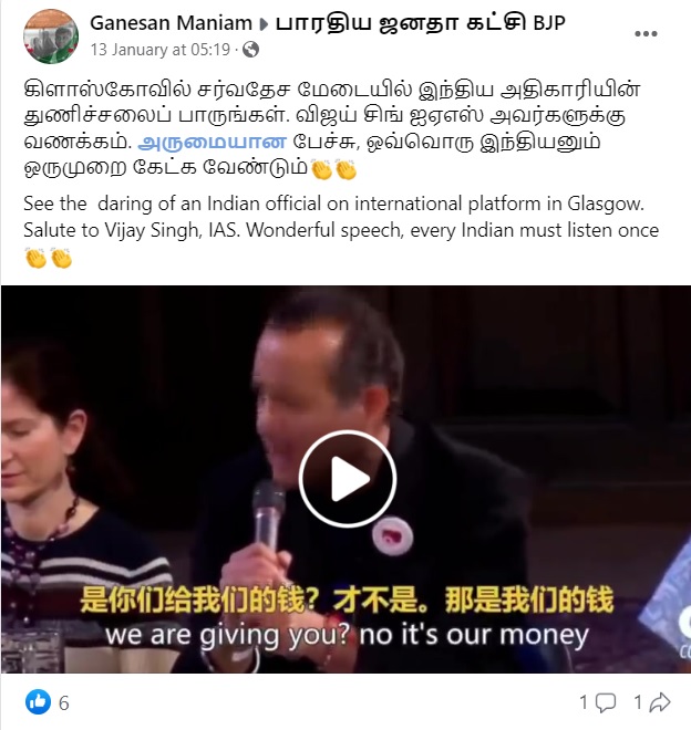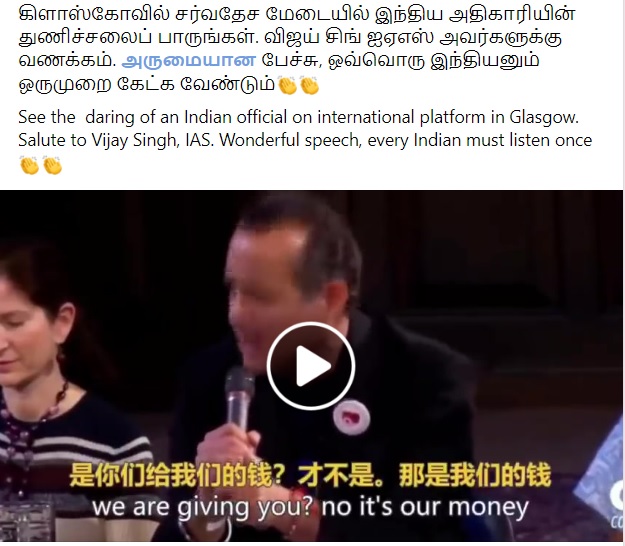“கிளாஸ்கோவில் சர்வதேச மேடையில் இந்திய அதிகாரியின் துணிச்சலைப் பாருங்கள். விஜய் சிங் ஐஏஎஸ் அவர்களுக்கு வணக்கம். அருமையான பேச்சு, ஒவ்வொரு இந்தியனும் ஒருமுறை கேட்க வேண்டும்” என்பதாக இந்த வீடியோ பரவி வருகிறது.