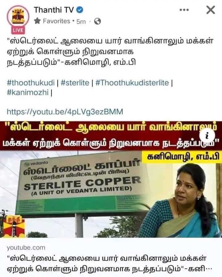 இதில் “ஸ்டெர்லைட் ஆலையை யார் வாங்கினாலும் மக்கள் ஏற்றுக் கொள்ளும் நிறுவனமாக நடத்தப்படும்” என்று கனிமொழி கூறியதாக தந்தி தொலைக்காட்சி செய்தி வெளியிட்டிருந்ததை காண முடிந்தது.
