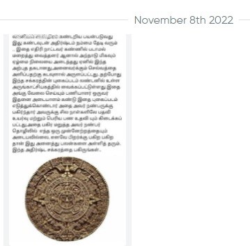 படத்தில் உள்ள இந்த சக்கரம் மாயன்களின் வானியல் சாஸ்திரம் கண்டறிய பயன்படுவது. இது கண்டவுடன் அதிர்ஷ்டம் நம்மை தேடி வரும். இதை எதிரி நாட்டவர் கண்ணில் படாமல் மறைத்து வைத்தனர். ஆனால் அந்நாடு மிகவும் ஏழ்மை நிலையை அடைந்தது. ஏனெனில் இந்த அற்புத தகடானது அனைவருக்கும் செல்வத்தை அளிப்பதற்கு கடவுளால் அருளப்பட்டது. தற்போது இந்த சக்கரத்தின் புகைப்படம் லண்டனில் உள்ள அருங்காட்சியகத்தில் வைக்கப்பட்டுள்ளது. இதை அங்கு வேலை செய்யும் பணியாளர் ஒருவர் இதனை அடையாளம் கண்டு இதை புகைப்படம் எடுத்துக்கொண்டார். அதை அவர் நண்பருக்கு பகிர்ந்தார். அவருக்கு சில நாட்களிலேயே பதவி உயர்வு மற்றும் பெரிய பண உதவியும் கிடைக்கப்பட்டது. அதை பகிர மறுத்த அவரின் நண்பர் தொழிலில் மிகப்பெரிய நஷ்டத்தை அடைந்தார், உடல்நிலையும் வெகுவாக பாதிக்கப்பட்டது. எனவே நெருக்கமான நண்பர்களுக்கு இந்த அதிர்ஷ்ட சக்கரத்தை பகிருங்கள்.