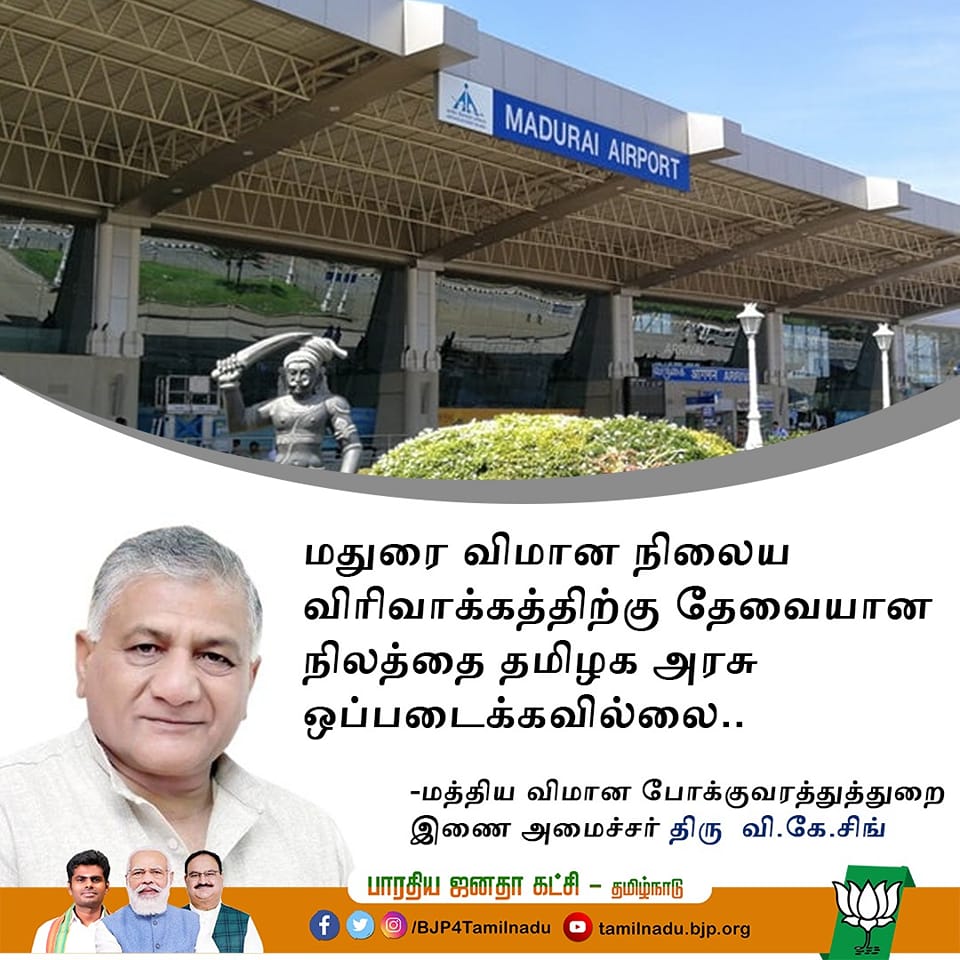 மேலும் குறிப்பிட்ட வைரல் புகைப்படம் பாஜக தமிழ்நாடு அதிகாரப்பூர்வ சமூக வலைத்தளப் பக்க லோகோவுடன் இருந்த காரணத்தினால் அதில் தேடியபோது, “மதுரை விமான நிலைய விரிவாக்கத்திற்கு தேவையான நிலத்தை தமிழக அரசு ஒப்படைக்கவில்லை” என்று அமைச்சர் வி.கே.சிங் கூறியதாக செய்திப்புகைப்படம் இடம் பெற்றிருந்தது.