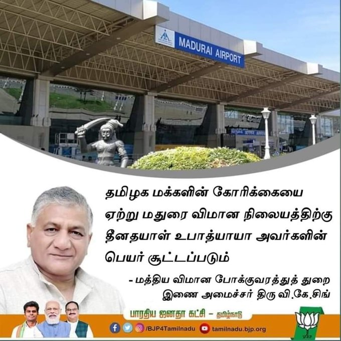 மதுரை விமான நிலையத்திற்கு தீனதயாள் உபாத்யாயா பெயர் சூட்டப்படும் என்று மத்திய விமான போக்குவரத்துத்துறை இணை அமைச்சர் வி.கே.சிங் கூறியதாக புகைப்படத்தகவல் ஒன்று சமூக வலைத்தளங்களில் பரவி வருகிறது.