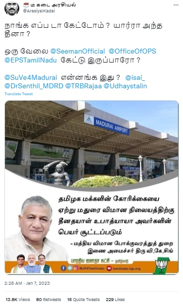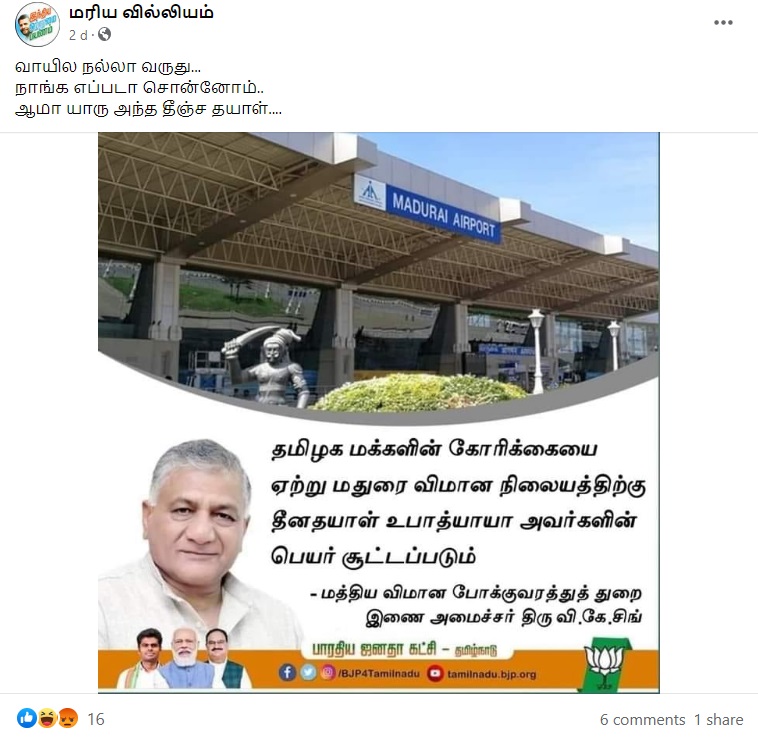 மதுரை விமான நிலையத்திற்கு தீனதயாள் உபாத்யாயா பெயர் சூட்டப்படும் என்று அமைச்சர் வி.கே.சிங் கூறியதாகப் பரவுகின்ற புகைப்படத்தகவல் குறித்த உண்மையறிய அதுகுறித்த ஆய்வில் ஈடுபட்டோம்.