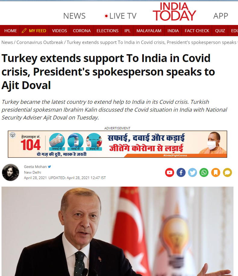 وائرل تصاویر کے ساتھ کئے گئے دعوے کی سچائی جاننے کے لئے ہم نے سب سے پہلے کچھ کیورڈ سرچ کیا۔ جہاں ہمیں انڈیا ٹوڈے پر شائع 28 اپریل 2021 کی ایک خبر ملی۔ جس کے مطابق ترکی مہلک وبا سے نپٹنے میں بھارت کی مدد کرنے کے لئے سامنے آیا ہے۔ اسی سلسلے میں بھارتیہ قومی سلامتی کے مشیر اجیت دو وال اور ترکی کے سفیر شاکر اوزکان ترونلار کے درمیان بات چیت ہوئی تھی۔ لیکن رپورٹ میں کہیں بھی یہ ذکر نہیں کیا گیا ہے کہ ترکی نے بھارت کو 30 ٹن آکسیجن اور طبی مدد بھیجی ہے۔