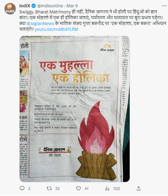دینک جاگرن کے “ایک محلہ ایک بکرا” والے اشتہار کو سب سے پہلے ہم نے گوگل ریورس امیج سرچ کیا۔ جہاں ہمیں 9 مارچ 2023 کو شیئر شدہ ان ڈیکس آن لائن نام کے ویری فائیڈ ٹویٹر ہینڈل پر وائرل تشہیر سے ملتا جلتا تشہیر والا پوسٹ ملا۔ دینک جاگرن کے اس اشہتار پر “ایک محلہ ایک ہولیکا” بڑے حروف میں لکھا ہوا تھا اور نیچے، “اس بار ہولی پر کوشش کریں کہ تھوڑی دوری پر الگ الگ ہولیکا جلانے کی جگہ جتنا ہو سکے، ایک محلے میں ایک ہی ہولیکا جلائیں۔ اس سے آلودگی گھٹےگی، اپناپن بڑھےگا”۔