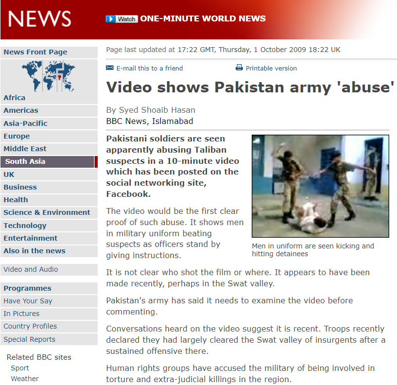 کشمیریوں پر بھارتی فوج کے تشدد کا بتاکر شیئر کی جارہی ویڈیو کو انوڈ کی مدد سے ہم نے پہلے کیفریم میں تقسیم کیا۔ ان میں سے چند فریم کو گوگل ریورس امیج سرچ کیا۔ لیکن کچھ بھی اطمینان بخش نتائج نہیں ملے۔ پھر ہم نے کیفریم کے ساتھ انگلش میں، پاک آرمی بیٹن پیوپل، کیورڈ سرچ کیا۔ اس دوران ہمیں بی بی سی اور الجزیرہ ویب سائٹ پر ہوبہو وائر ویڈیو کے کیفریم کے ساتھ شائع اکتوبر 2009 کی رپورٹس ملیں۔ بی بی سی کی رپورٹ کے مطابق پاکستانی فوج نے مشکوک طالبانی پر تشدد کیا۔ یہ تشدد کی 10 منٹ کی ویڈیو جس میں گالی گلوچ بھی سنا جاسکتاہے فیس بک پر وائرل ہوگئی۔