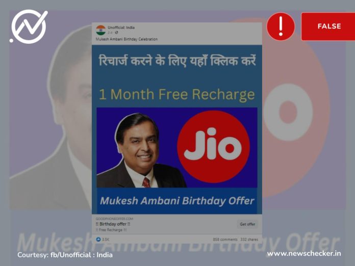 فیس بک پر ایک پوسٹ شیئر کر دعویٰ کیا گیا کہ جیو کمپنی نے مکیش امبانی کی یوم پیدائش پر ایک ماہ کا مفت ریچارج دینے کا اعلان کیا ہے۔ جبکہ تحقیقات سے پتا چلا کہ وائرل دعویٰ بے بنیاد ہے اور جیو نے مکیش امبانی کی یوم پیدائش پر کوئی مفت ریچارج اسکیم نہیں چلائی ہے۔ پورا فیکٹ چیک یہاں پڑھیں۔