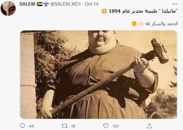 سوشل میڈیا پر ہاتھوں میں ہتھوڑا لی ہوئی خاتون کی ایک تصویر خوب شیئر کی جا رہی ہے۔ صارفین کا دعویٰ ہے کہ “مٹِلڈا نامی 1894 کی اینستھیزیولوجسٹ خاتون کی یہ تصویر ہے”۔