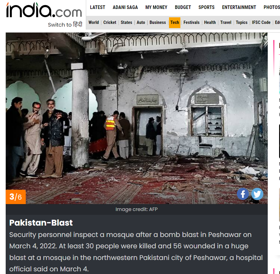 ہم نے پشاور کی مسجد میں ہوئے دھماکے کی بتاکر شیئر کی گئی تصویر کو گوگل ریورس امیج سرچ کیا۔ جہاں ہمیں انڈیا ڈاٹ کام کی ویب سائٹ پر شائع 4 مارچ 2022 کی ایک رپورٹ ملی۔ جس میں مذکورہ وائرل تصویر کے سلسلے میں لکھا ہے کہ پشاور کی قصہ خوانی بازار مسجد میں جمعہ کے دن دھماکہ ہوا تھا، جس میں 45 نمازی شہید ہوگئے تھے، مسجد میں اس وقت تقریبا 150 نمازی موجود تھے۔