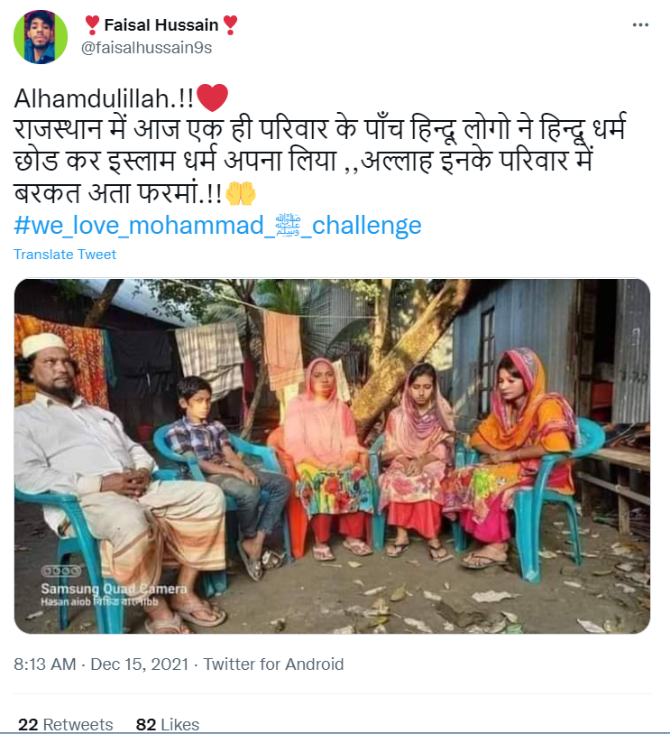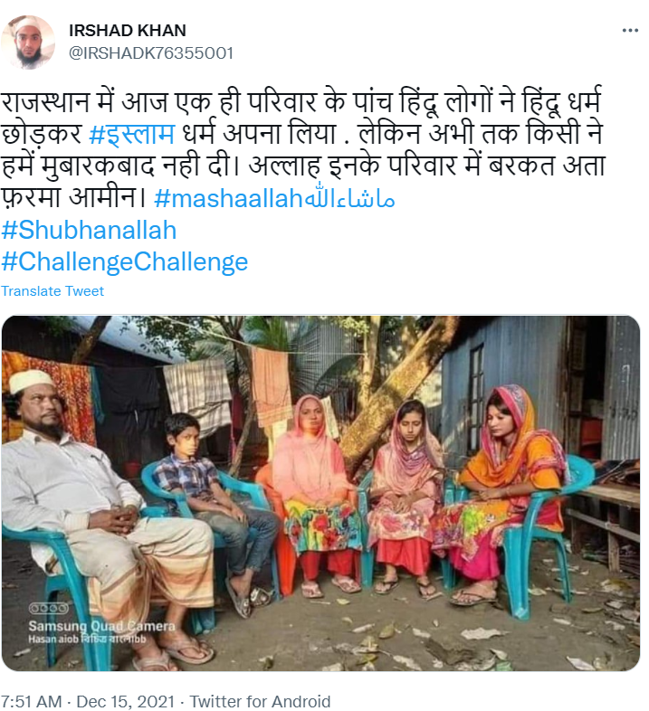 صارفین نے ایک تصویر کے کیپشن میں لکھا ہے کہ “راجستھان میں آج ایک ہی خاندان کے پانچ افراد نے ہندو مذہب چھوڑ کر اسلام قبول کر لیا ہے؛اللہ ان کےخاندان میں برکت عطاء فرما”۔