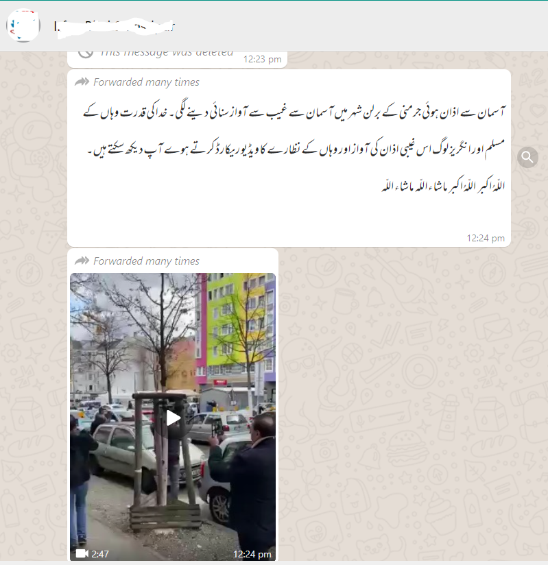 سوشل میڈیا پر 2 منٹ 48 سیکینڈ کا ایک ویڈیو خوب شیئر کیا جا رہا ہے۔ صارفین کا ویڈیو سے متعلق دعویٰ ہے کہ جرمنی کے برلن شہر میں غیب سے اذان کی آواز سنائی دے رہی ہے، جسے وہاں کے لوگ اپنے موبائل کیمرہ میں قید کر رہے ہیں۔