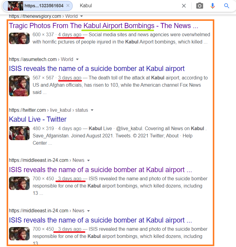 زخمی لڑکی کی وائرل تصویر کی سچائی جاننے کے لئے ہم نے اپنی ابتدائی تحقیقات شروع کی۔ سب سے پہلے ہم نے وائرل تصویر کو گوگل ریورس امیج سرچ کیا۔ جہاں ہمیں زخمی لڑکی کی تصویر سے متعلق کئی لنک فراہم ہوئے، جنہیں حالیہ خبروں میں شائع کیا گیا ہے۔ ان خبروں میں بچی کی تصویر کو کابل ایئرپورٹ خودکش حملے سے جوڑ کر شائع کیا گیا ہے۔ آپ درج ذیل میں موجود اسکرین شارٹ میں دیکھ سکتے ہیں۔