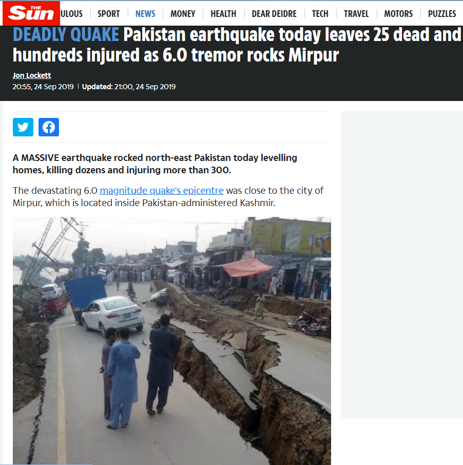 افغانستان زلزلے سے منسوب کرکے شیئر کی جا رہی خستہ حال سڑک والی تصویر کو ریورس امیج سرچ کیا تو ہمیں لائیو منٹ اور دی سن نیوز ویب سائٹس پر 24 اور 25 ستمبر 2019 کو شائع خبروں میں ہوبہو وائرل تصویر ملی۔ دی سن کے مطابق خستہ حال سڑک کی تصویر پاک مقبوضہ کشمیر کے میر پور کی ہے۔ جہاں 0۔6 کی شدت سے زلزلے کا جھٹکا محسوس کیا گیا تھا۔ اس حادثے میں 25 افراد کی موت ہوگئی تھی، جبکہ تقریباً سینکڑوں لوگ زخمی ہوئے تھے۔