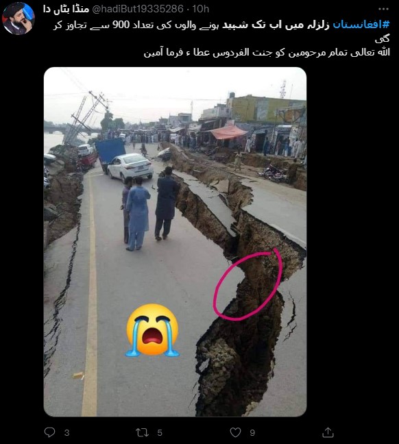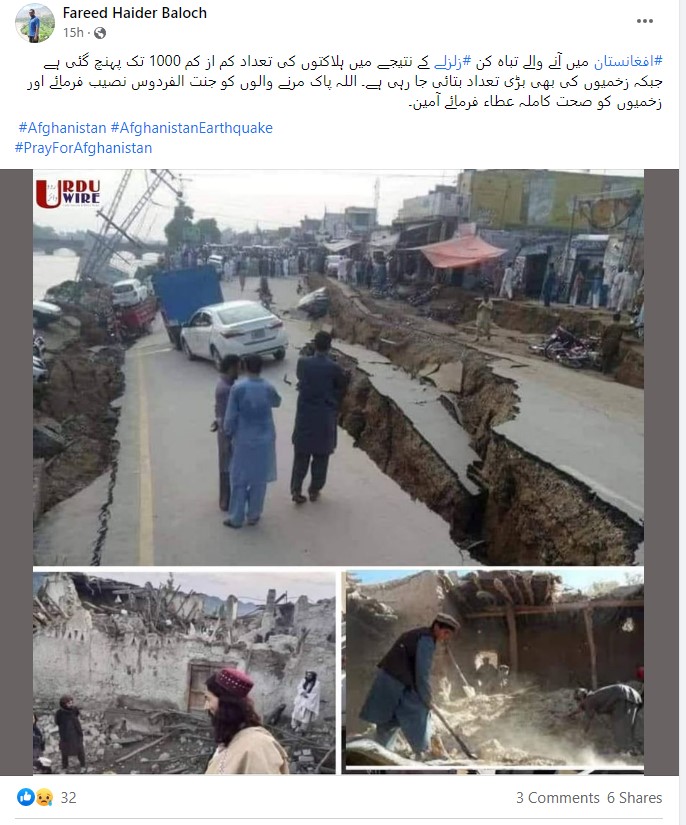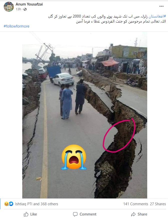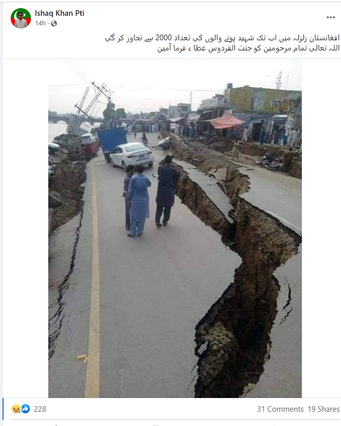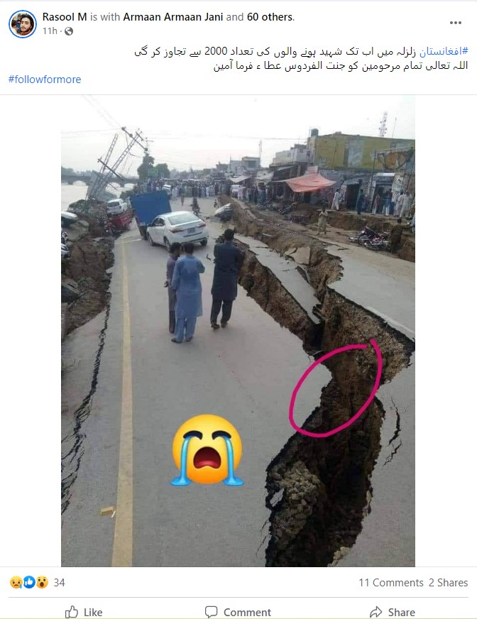 خستہ حال سڑک والی تصویر کو فیس بک پر بھی شیئر کیا جا رہا ہے۔ تصویر کے کیپشن میں ایک صارف نے لکھا ہے کہ “افغانستان زلزلے میں اب تک شہید ہونے والوں کی تعداد 2000 سے تجاوز کر گٸ، اللہ تعالی تمام مرحومین کو جنت الفردوس عطاء فرما آمین”۔ اس تصویر کو دیگر صارفین نے بھی شیئر کیا ہے، البتہ سب نے اپنے مطابق ہلاکت کی تعداد شمار کی ہے۔