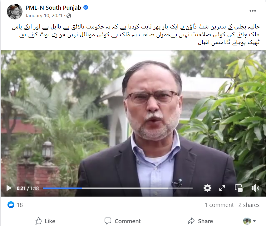 شمیم محمد پی ٹی آئی نامی صارف نے اپنے ویری فائڈ ٹویٹر ہینڈل سے احسن اقبال کی اس ویڈیو کو شیئر کرتے ہوئے دعویٰ کیا کہ 23 جنوری کو پاکستان میں بجلی کے بریک ڈاؤن کے بعد احسن اقبال نے مذکورہ بیان دیا ہے۔ ویڈیو کے ساتھ کیپشن میں انہوں نے لکھا ہے کہ بجلی کے اچانک بریک ڈاون پر مسلم لیگ (ن) کے سابق وزیر توانائی احسن اقبال کا اہم بیان۔