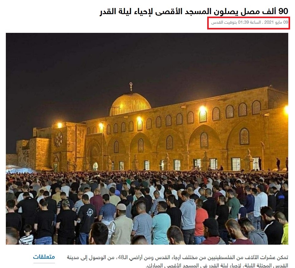 سوشل میڈیا پر وائرل بیت المقدس میں نماز تراویح کی تصاویر کی سچائی جاننے کے لئے ہم نے سب سے پہلے تینوں تصاویر کو گوگل ریورس امیج سرچ کیا۔ اس دوران ہمیں، بوابة إفريقيا الإخبارية، نامی عربی نیوز ویب سائٹ پر 8 مئی 2021 کو وائرل تصاویر کے ساتھ شائع شدہ ایک رپورٹ ملی۔ رپورٹ کے ہیڈلائن کا ترجمہ کرنے پر پتا چلا کہ یہ تصاویر 90 ہزار فلسطینیوں کے بیت المقدس میں نماز تراویح اور لیۃ القدر میں شریک ہونے کی ہے۔