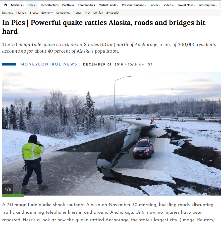 اس کے علاوہ دی الاسکا لائف اور اے بی سی نیوز نامی ویب سائٹس پر دسمبر 2018 کو شائع شدہ رپورٹس میں ہوبہو تصویر اور ویڈیو دیکھنے کو ملی۔ ان رپورٹس میں بھی وائر تصویر کو الااسکا کے اینکریج ایئر پورٹ والے راستے کا بتایا گیا ہے۔ بتادوں کہ 30 نومبر 2018 کو بھی الاسکا میں شدید زلزلے کا جھٹکا محسوس کیا گیا تھا۔