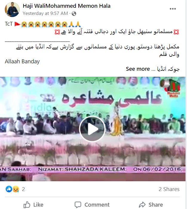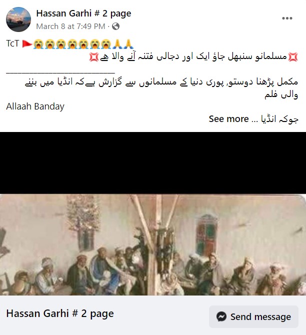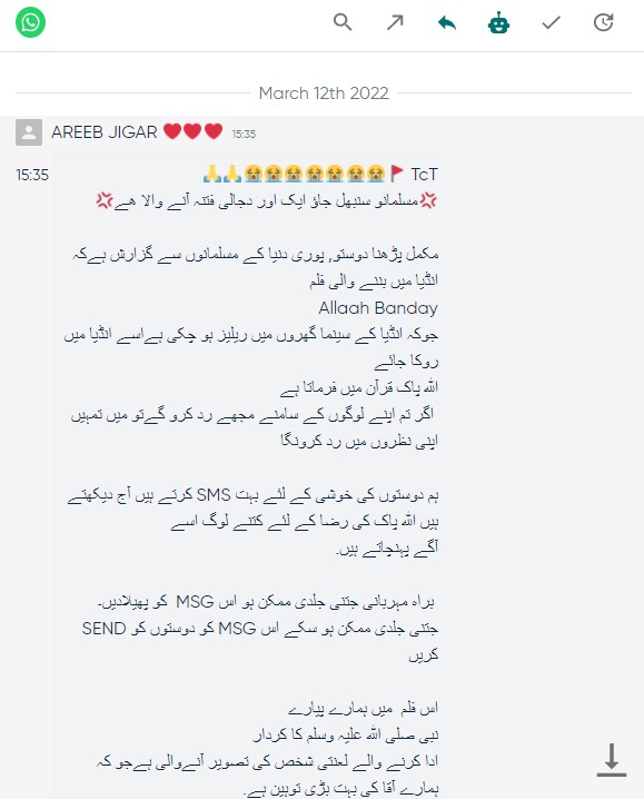 سوشل میڈیا پر ایک مضمون شیئر کیا جا رہا ہے، جس میں دعویٰ کیا گیا ہے کہ “بھارت میں اللہ کے بندے فلم ریلیز ہو چکی ہے اسے روکا جائے، اس فلم میں ہمارے پیارے نبی صلی الله علیہ وسلم کا کردار ادا کرنے والے شخص کی تصویر آنے والی ہے جو کہ ہمارے آقاؐ کی بہت بڑی توہین ہے”۔ اس مضمون کو ہمارے ایک قاری نے بھی آفیشل واہٹس ایپ نمبر پر تحقیقات کے لئے بھیجا ہے۔