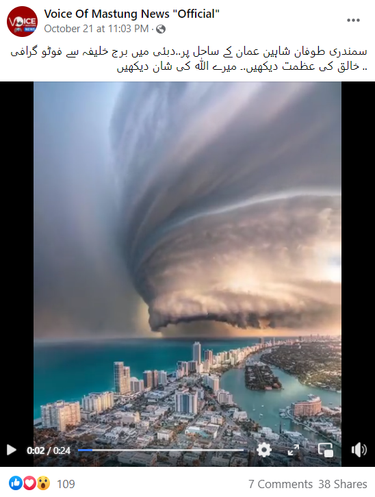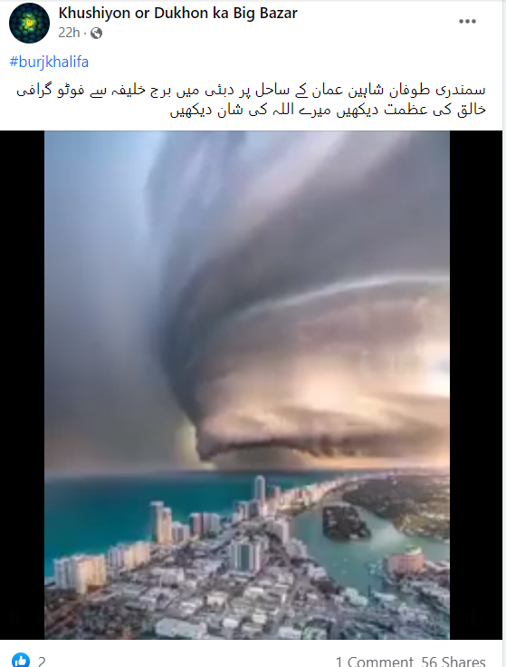 سوشل میڈیا پر 24 سیکینڈ کے ایک ویڈیو کو خوب شیئر کیا جا رہا ہے۔ جس کے ساتھ کیپشن میں صارفین نے لکھا ہے کہ “یہ ویڈیو عمان میں آئے شاہین طوفان کا ہے۔ جس کی فوٹو گرافی دبئی کے برج خلیفہ سے کی گئی ہے”۔