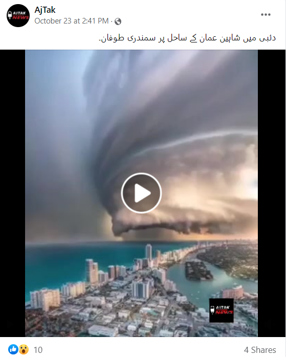 اکتوبر ماہ کے شروع میں عمان میں شاہین طوفان کا قہر برپا ہوا تھا۔ میڈیا رپورٹ کے مطابق شاہین طوفان نے تیز بارش اور ہواؤں کے ساتھ عمان کے ساحلی علاقے میں دستک دی تھی۔ جس کی وجہ سے 4 افراد فوت ہوگئے تھے۔ اسی کے پیش نظر ان دنوں ایک طوفان کا ویڈیو سوشل میڈیا پر خوب گردش کر رہا ہے۔ صارفین کا دعویٰ ہے کہ عمان میں آئے شاہین طوفان کا یہ منظر ہے۔ صارفین نے ویڈیو کے کیپشن میں لکھا ہے کہ”یہ ویڈیو عمان کے ساحل پر آئے سمندری طوفان شاہین کا ہے۔ جس کی فوٹو گرافی برج خلیفہ سے کی گئی ہے۔