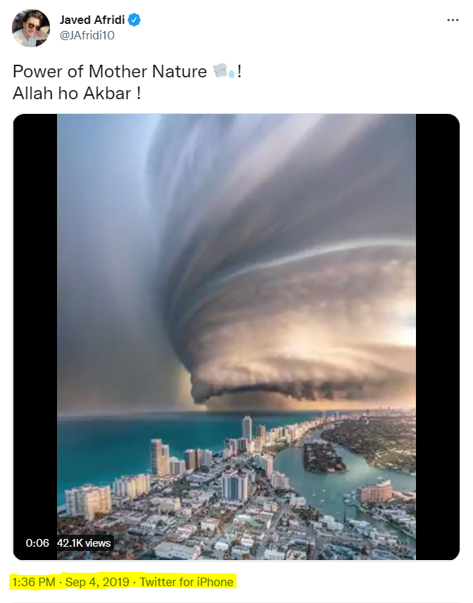 ٹویٹر ایڈوانس سرچ کے دوران ہمیں پاکستان کے ہایر اینڈ روبا کے سی ای او جاوید آفریدی نامی آفیشل ٹویٹر ہینڈل پر وائرل ویڈیو ملا۔ جسے 4 ستمبر 2019 کو انگلش کیپشن کے ساتھ شیئر کیا گیا تھا۔ لیکن یہ ویڈیو کہاں اور کس شہر کی ہے، یہ واضح نہیں کیا گیا ہے۔ البتہ اس پوسٹ سے اتنا واضح ہوتا ہے کہ ویڈیو کا تعلق حالیہ عمان میں آئے شاہین طوفان سے نہیں ہے۔۔