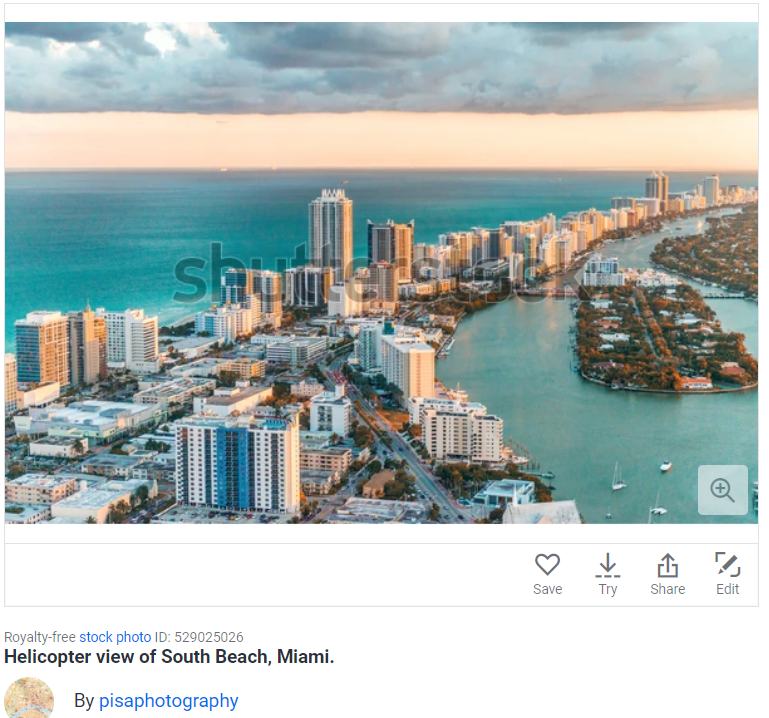 پھر ہم نے ویڈیو کے اوپر اور نچے والے حصے کو الگ الگ کرکے کروپ کیا اور اسے ریورس امیج سرچ کیا۔ اس دوران ہمیں شٹر اسٹاک نامی ویب سائٹ پر دونوں تصاویر سے ملتی جلتی تصاویر ملیں۔ ویب سائٹ کے مطابق ساحل کنارے بنی عمارتوں والی تصویر ہیلی کاپٹر سے کلک کی گئی ساؤتھ بیچ میامی کی ہے۔ جب ہم نے مذکورہ نام کو گوگل پر سرچ کیا تو پتا چلا کہ جنوبی ساحل فلوریڈا کے میامی ساحل کا ہی ایک حصہ ہے۔