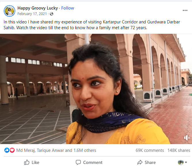 ہم نے لنک کلک کیا تو 17 فروری 2021 کو شیئر شدہ ہپی گرووی لکی نام کے فیس بک پیج پر 25 منٹ 27 سکینڈ پر مشتمل ہوبہو ویڈیو ملی۔ جس کے ساتھ دی گئی معلومات کے مطابق ویڈیو میں نظر آرہی لڑکی پاکستان میں موجود کرتار پور کوری ڈور گردوارا دربار صاحب جانے کا تجربہ بیان کر رہی ہے۔ جہاں ایک خاندان کی ملاقات 72 سال بعد ہوئی۔