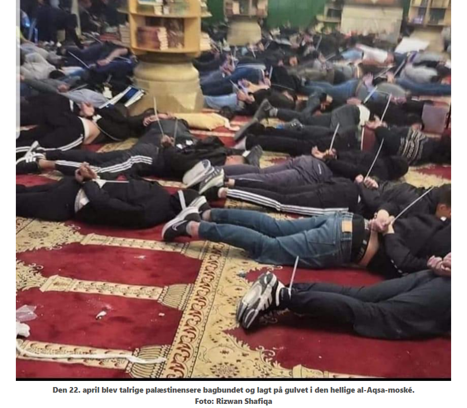 رمضان المبارک کے دوران مسجد اقصیٰ کے اندر فلسطینیوں پر اسرائیلی فوج کے تشدد کا بتاکر شیئر کی گئی تصویر کو ہم نے گوگل ریورس امیج سرچ کیا۔ جہاں ہمیں ڈین مارک سے ڈینش زبان میں شائع ہونے والی نیوز ایجنسی اربیجڈرین کی ویب سائٹ پر 29 اپریل 2022 کی ایک رپورٹ ملی۔ جس میں وائرل تصویر کو 22 اپریل 2022 کو مسجد اقصی میں فلسطینیوں پر ہوئے تشدد کا بتایا گیا ہے۔