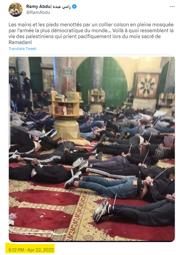 اس کے علاوہ 22 اپریل 2022 کو رامی عبدہ نام کے ٹویٹر صارف نے بھی مذکورہ وائرل تصویر کو شیئر کیا ہے۔ اب یہ معلوم ہوتا ہے کہ وائرل تصویر کا تعلق حالیہ مسجد اقصیٰ میں فلسطینی مصلی القبلی پر ہوئے حملے سے نہیں ہے۔