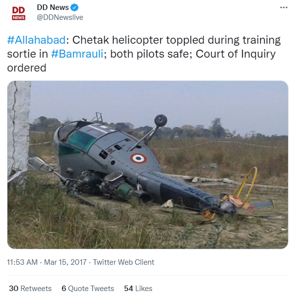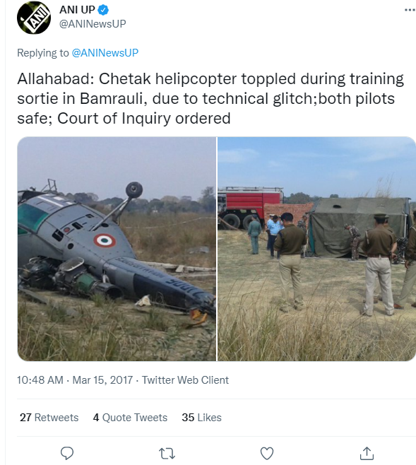 مزید سرچ کے دوران ہمیں ڈی ڈی نیوز اور نیوز ایجنسی اے این آئی کے آفیشل ٹویٹر ہینڈل پر وائرل تصویر ملی۔ جس میں واضح کیا گیا ہے کہ اترپردیش کے الہٰ آباد کے بمرولی میں چیتک ہیلی کاپٹر ٹریننگ کے دوران حادثے کا شکار ہو گیا تھا، اسی کی یہ تصویر ہے۔ اس سے واضح ہو چکا کہ جس تصویر کو جموں کشمیر کے ادھم پور ہیلی کاپٹر حادثے سے جوڑ کر شیئر کیا جا رہا ہے وہ دراصل 4 سال پرانی اور پریاگ راج کے بمرولی آئی اے ایف ہیلی کاپٹر حادثے کی ہے۔