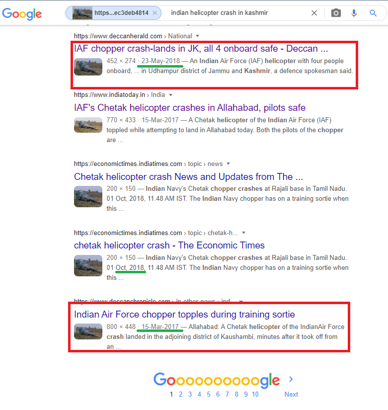 نیوز چیکر کی تحقیقات میں یہ ثابت ہوتا ہے کہ جموں کشمیر کے ادھم پور ہیلی کاپٹر حادثے کے نام پر وائرل تصویر کم از کم 4 سال پرانی ہے۔ دراصل یہ تصویر اترپردیش کے الہٰ آباد کے بمرولی میں ٹریننگ کے دوران درپیش چیتک ہیلی کاپٹر حادثے کی ہے۔