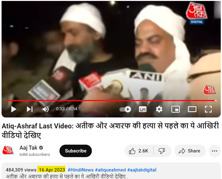سابق ایم پی عتیق احمد اور ان کے بھائی اشرف کی سرعام قتل کی ویڈیو کے ایک فریم کو ہم نے سب سے پہلے آج تک کے آفیشل یوٹیوب چینل کے تلاش کے آپشن پر “عتیق اور اشرف کی گولی مارکر ہتھیا” ہندی میں کیورڈ سرچ کیا۔ جہاں ہمیں اپریل 2023 میں اپلوڈ ہونے والی متعدد ویڈیو رپورٹس فراہم ہوئیں۔ جس میں کئی رپورٹس میں وائرل ویڈیو کو بخوبی دیکھا جا سکتا ہے۔