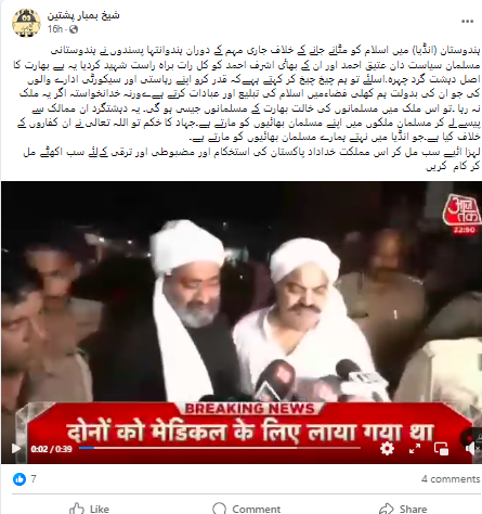 ایکس صارف نے ویڈیو کے ساتھ کیپشن میں لکھا ہے کہ “ہندوستان(انڈیا) میں اسلام کو مٹائے جانے کے خلاف جاری مہم کے دوران ہندو انتہا پسندوں نے ہندوستانی مسلمان سیاست دان عتیق احمد اور ان کے بھائی اشرف احمد کو کل رات براہ راست شہید کردیا۔ یہ ہے بھارت کا اصل دہشت گرد چہرہ”۔