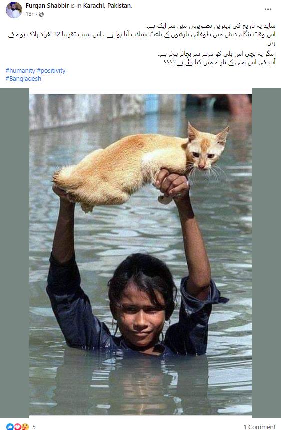 انسانیت کی مثال پیش کرتی ایک تصویر کو سوشل نٹورکنگ سائٹس پر بنگلہ دیش میں آئے حالیہ سیلاب کا بتا کر شیئر کیا جا رہا ہے۔ صارف نے تصویر کے کیپشن میں لکھا ہے کہ “شاید یہ تاریخ کی بہترین تصویروں میں سے ایک ہے۔ اس وقت بنگلہ دیش میں طوفانی بارشوں کے باعث سیلاب آیا ہوا ہے، اس سبب تقریباً 32 افراد ہلاک ہو چکے ہیں۔ مگر یہ بچی اس بلی کو مرنے سے بچائے ہوئے ہے۔ آپ کی اس بچی کے بارے میں کیا رائے ہے؟؟؟؟”۔