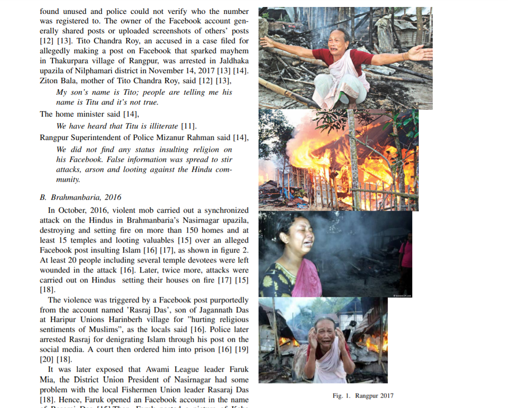 دونوں ویب سائٹ پر نومبر 2017 کو شائع آرٹیکلس کے مطابق نومبر2017 میں رنگ پور(بنگلہ دیش) کے ٹیٹو چندرا راؤ نامی ایک شخص نے ایک بھڑکاؤ پوسٹ شیئر کر دی تھی، جس نے مسلمانوں کے جذبات کو مجروح کر دیا تھا۔ جس کے بعد 10 نومبر 2017 کو کئی ہندو گھروں کو جلا دیا گیا تھا۔ اس حادثے میں ایک شخص کی موت بھی واقع ہوئی تھی۔